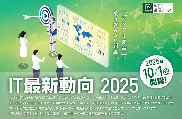 IT最新キーワードの理解に最適な大人気の通信コース「IT最新動向 Web通信コース」の2025年下半期版が開講します!「デジタル変革」に乗り遅れない組織へ、最新キーワードの理解に是非お役立て下さい。
